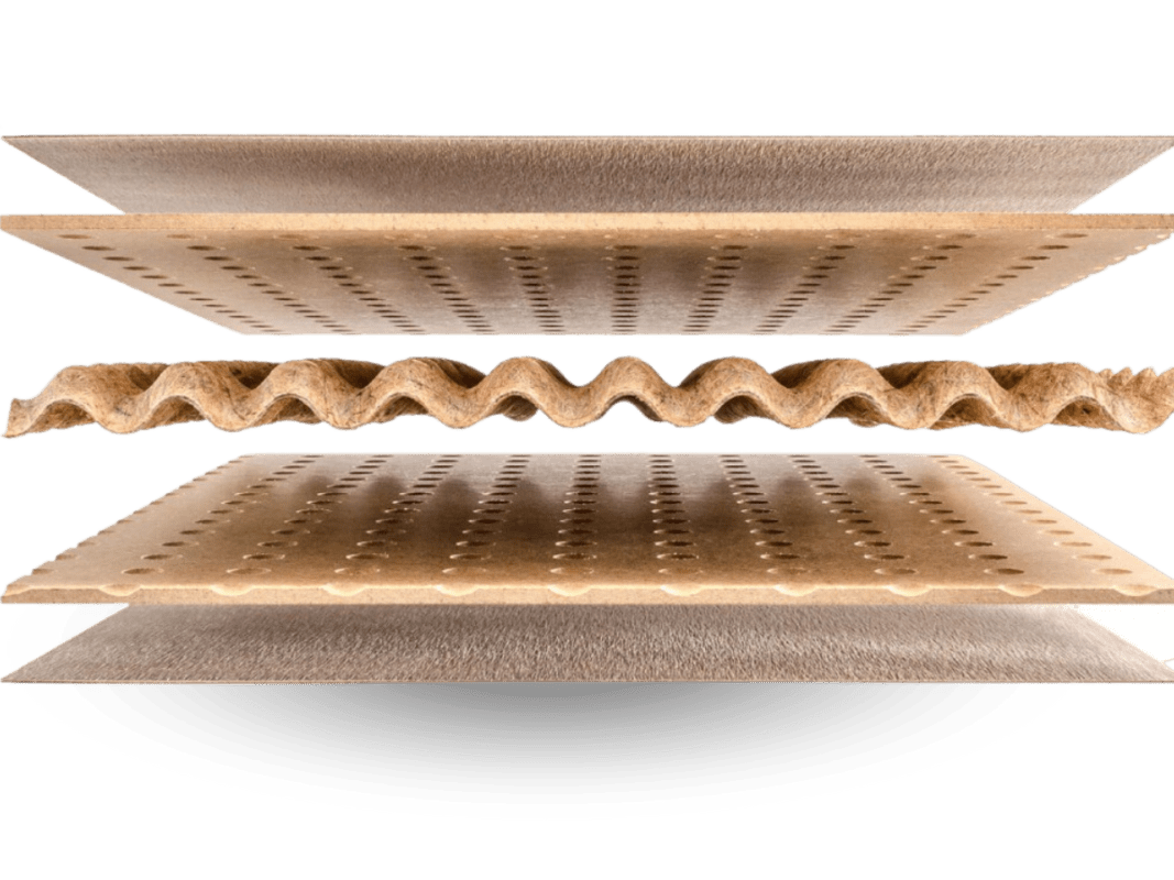 lisocore® ist ein materialeffizienter Hochleistungs-Werkstoff. Dieser besteht aus mindestens zwei dünnen Deckschichten, die durch eine dreidimensional geformte Kernstruktur miteinander verbunden sind.